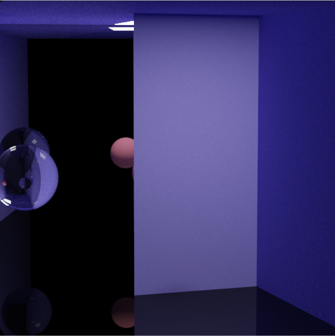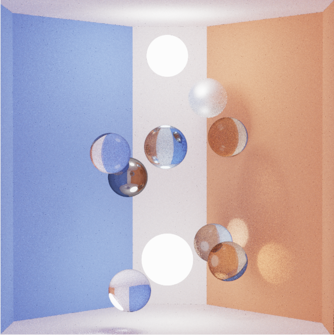 Multiple importance sampling with global illumination. Support for environment maps, spot lights, area lights, and point lights. Dielectric, microfacet, and diffuse materials.
